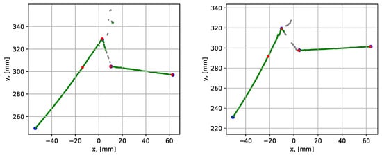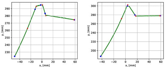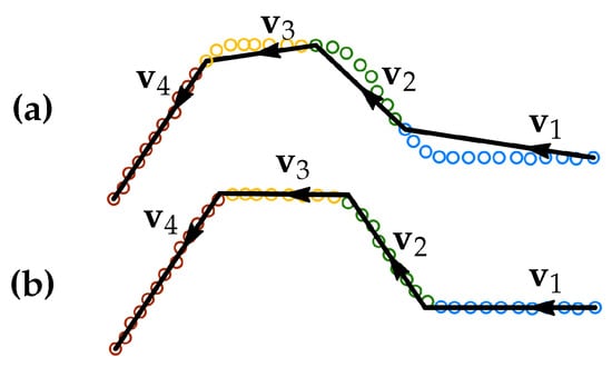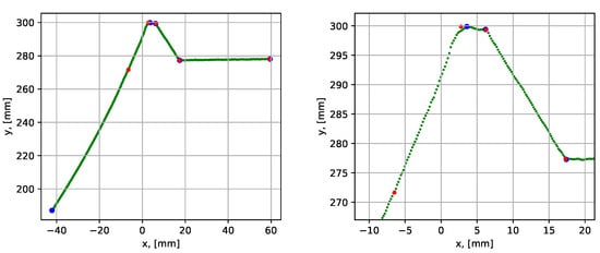 The first iteration starts. The points are divided into point sets using (7), which is shown in three different colors. Then, the translation (8) (for ) and the rotation to the line fit is applied for segment 1. The start point of line segment 2 is aligned with the new position of , and the translation (8) (for ) and the rotation to the line fit is applied for segment 2. The same operation is done for segment 3. The second iteration starts. The points are divided into point sets again, considering the new locations of the segments and the alignment is done for all three segments again. The procedure normally gives reasonable results after 4–5 iterations. Alternatively, a loop exit condition can be defined based on the convergence threshold for the position of the segment end points.