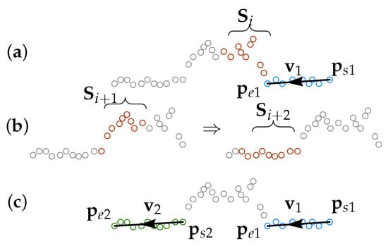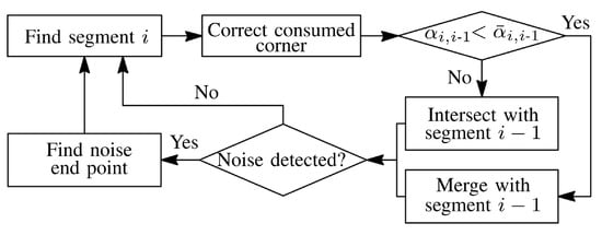 If the noise is detected in the set , then a new set is checked for noise, see Figure 15b. The first point in the set is selected to be . This process continues until a noise-free set is found. When the first noise-free point set is found, then the first point of the set is used for the RANSAC search of the next line segment, see Figure 15c. The flow diagram of the procedure is shown in Figure 16.