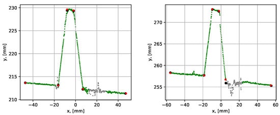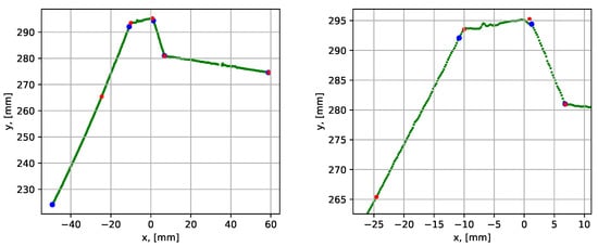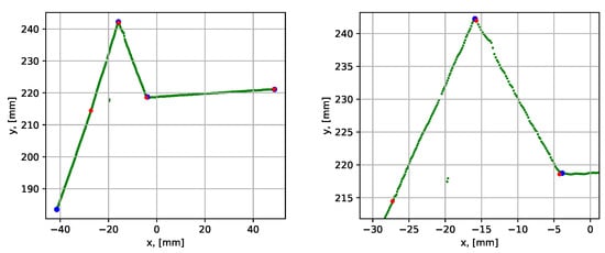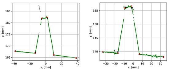 The N3 noise is different from the N1 and N2 types since it is mostly caused by the dominant part of spread reflections towards the other wall of the groove. This means that the noisy points are not necessarily located chaotically in the direction (see, for example, Figure 22). The noisy points can, alternatively, form rather well-structured line segments in the false locations, see the graph to the right in Figure 24. In this case, the only effective noise detection condition is (11). Regardless of the more complex noise detection problem, the execution times and the average point-to-segment errors were similar to all other cases considered in this subsection, see Table 4.
