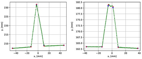 As in our work, a set of groove corner points is often selected as a parametrization basis in the previously reported methods. The dominant approaches for groove parametrization are the methods based on gradients, which can be both of the first-order or the second-order, or various combination of both [,,]. These approaches proved to be fast enough to be used in real-time weld seam tracking. The results reported in Section 4 suggest that the proposed method is running at approximately 10 Hz, which can be too slow for some real-time seam tracking. On the other hand, due to the nature of data gradient functions, the obtained parametrization results might be poor for triangulated points with a lot of data noise.