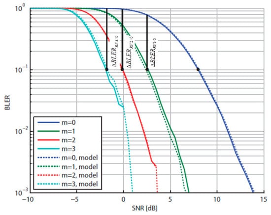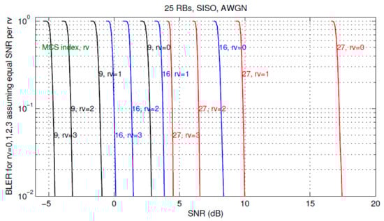 Accordingly, in the exemplar Figure 2 for a small bandwidth, such as with 1 Physical Resource Block (PRB) conforming to 12 subcarriers [24,25], typical RV BLER curves (e.g., for CQI = 6) are shown [26], where the coding gains , of an RVi with respect to RV0, pertain to the target value of BLER = 0.1 [27,28].