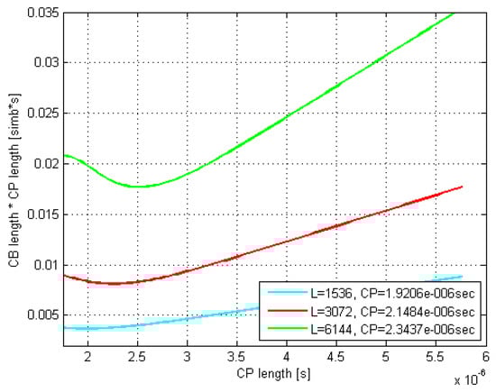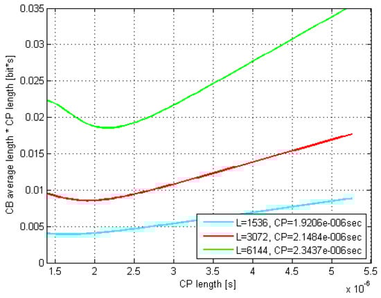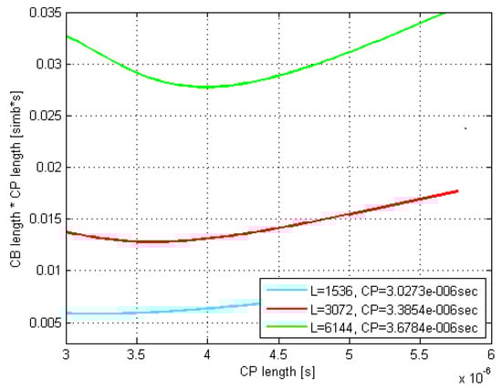 Thus, based on (30), the CP-related duration of the average gross codeblock was graphed for each selected modulation type and delay spread value, to identify the curve minimum and then checked whether it matched the corresponding optimal value, estimated by (29).