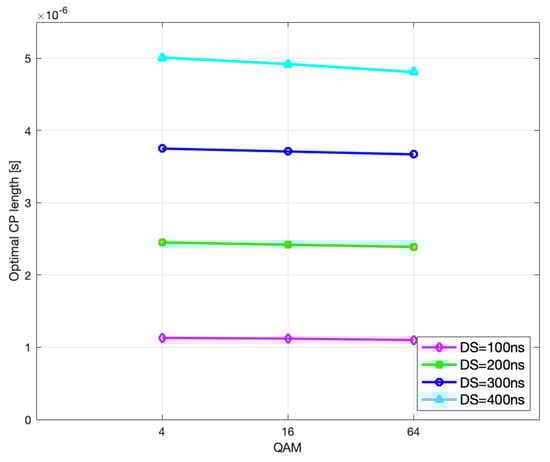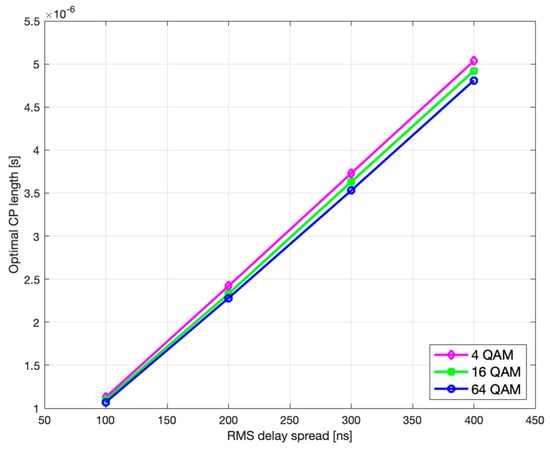 Finally, we verify the CP optimization model for the three LTE modulation types and the rms delay spreads of up to 400 ns, attributed to the propagation environments ranging from indoor to typical urban [22], where the latter is included since, nowadays, its median rms delay spread is significantly reduced, as is pointed out in Section 2.2.