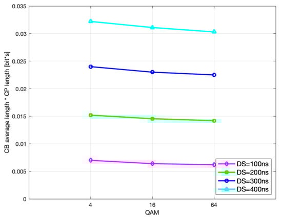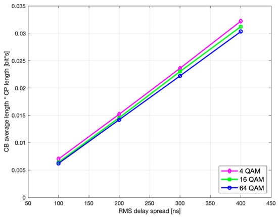 Likewise, further analysis shows that the optimal CP length and the corresponding CP-weighted duration of codeblock average gross length slowly decrease with higher modulation order, as seen in Figure 11 and Figure 12, which is in accordance with (29) and (30), respectively.