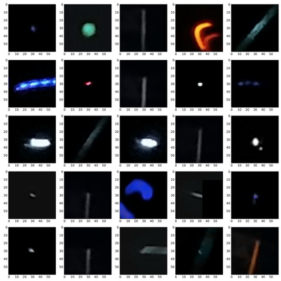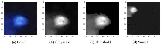 The CNN input layer can be fed with raw images that in case of CREDO data are 60 × 60 (RGB) three-layer colour images. Given the great diversity of artefact images in terms of types and shapes we came up with a design which focuses on general image properties like the shape of the border or the connectedness of the image pattern. These general properties can be amplified by applying wavelet transformation. As a result, one obtains the averaged image along with horizontal and vertical fluctuations which amplify horizontal and vertical border components, respectively. Accordingly, the raw data are subject to preprocessing as per the recipe below. The first preprocessing step is a greyscale conversion, which is implemented by summing up the channels. This step is aimed to remove a redundant information which does not carry any physical interpretation. The colour of the pixel is associated with the colour filter, overlaid on the CMOS array, that happened to be hit during detection. This is basically a random event and is not correlated to radiation species. The next step is the noise reduction. As the analysed images were of different overall brightness, we decided to apply a noise cut-off algorithm which depends on the average brightness. Moreover, images marked as “artefacts” usually differ from “non-artefacts” by a few standard deviations in brightness. The two above mentioned quantities were used to define the cut-off threshold, i.e., average and standard deviation of brightness (Equations (2) and (3)). The threshold was determined for each image separately. The standard deviation was calculated for the total brightness of each image: