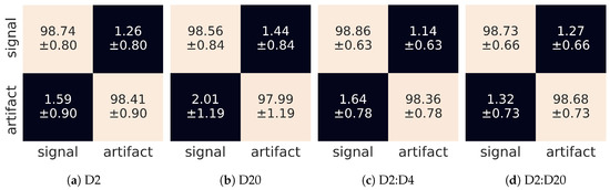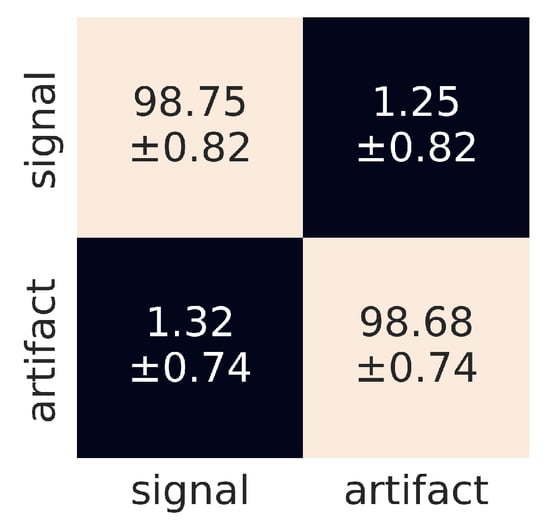 In this section, we present the results obtained using the method discussed in Section 2. To select the optimal form of the input to the CNN, apart from the adaptive thresholding discussed in Section 2.3, we tested several types and combinations of Daubechies wavelet transforms available in Mahotas library [57]. In Table 5, we show the recognition accuracy rates for the input signals in the form of a single wavelet (1-dimensional input tensor). All results have been evaluated using the repeated 5-fold cross-validation. Apparently, the application of any type of the wavelet from the set (D2, D4, ..., D20) results in a recognition rate, for both signals and artefacts, equal to 98% within two standard deviations.