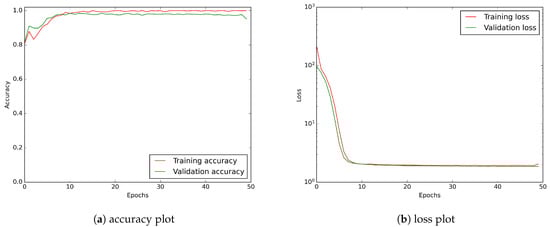 In Figure 10, we have shown the accuracy and the loss function values vs. the number of epochs. Both of them show that the learning process saturates at about the 20th epoch. Thus, the 50 epoch training we use is more than satisfactory.
