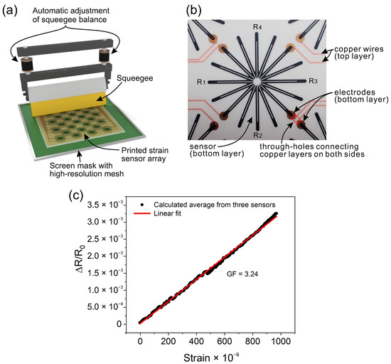 (a) Screen printing of the strain sensor array. (b) Back view of a single strain sensor incorporated into the array of 25 sensors. R show the particular resistive elements of the printed structure that complete the full-Wheatstone-bridge circuit. (c) Strain sensitivity calculated based on the average of three printed strain sensors.