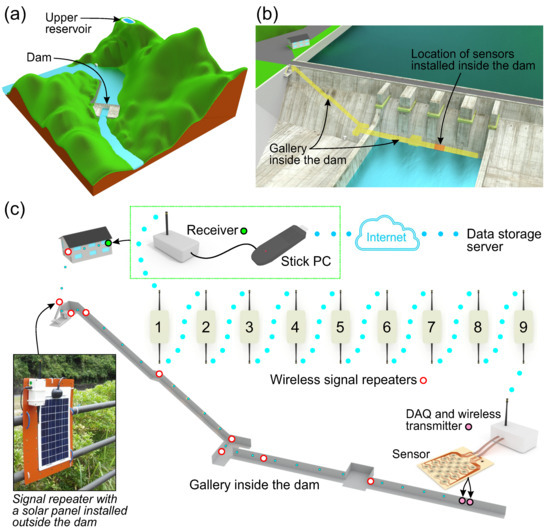 Each sensor array was equipped with a wireless transmitter that incorporated a 25-channel, 24 bit analog-to-digital converter (ADC). The operation of the transmitters was controlled by specially designed computer software (LabView, National Instruments) that provided an interface with a wireless receiver, which was capable of sending commands to and receiving data from the transmitters connected to the sensors. To provide remote control of the entire sensing system, the computer was connected to a portable long-term evolution router. Therefore, the system could be controlled from any location that had access to the Internet. In this study, the sensors were installed inside a gravity dam, which is a large concrete engineering structure. Thus, the challenging part of this project was remote communication between the transmitters installed inside the dam and the receiver installed outside in a storage building located near the dam (Figure 2c). To enable communication, a system of networked signal repeaters was deployed along the gallery. In total, nine signal repeaters were used. Seven of these were installed inside the dam, and the other two were installed outside. The developed wireless data acquisition system was operated at a frequency of 920 MHz. Inside the dam, the power supply to the transmitters and signal repeaters was obtained from a 5 V AC adapter that was connected to a 100 V waterproof electric socket, which was originally installed in the dam. One of the signal repeaters was installed outside, and it provided wireless communication between the dam and the storage building. It was equipped with a portable solar panel to charge a built-in battery (see the inset of Figure 2c).