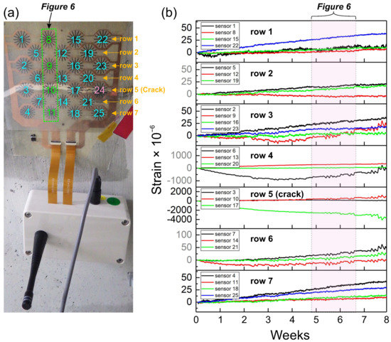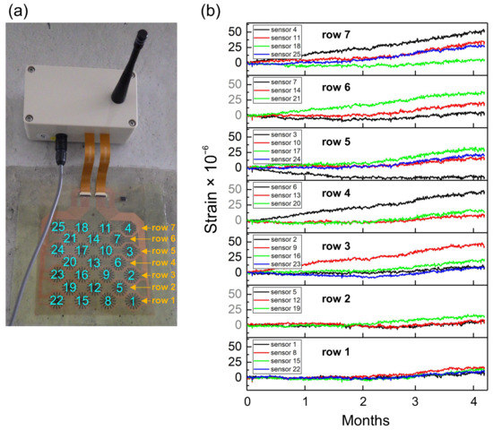 (a) Sensor array with the connected wireless transmitter installed on a surface with no crack. The numbers correspond to specific sensors in the array. To make it easier to distinguish data between all 25 sensors, the results were analyzed with respect to the rows in the array. (b) Four-month-long static strain measurement to assess the long-term stability of the sensors.