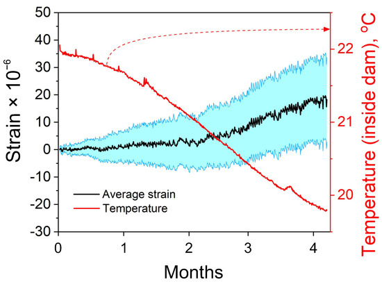 Average static strain calculated from all sensors in the array. The blue band represents the calculated error. The collected strain data are presented with the temperature measurements recorded inside the dam.