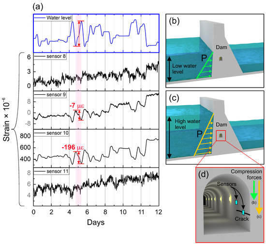 (a) Comparison of the measured static strain variations with recorded water level changes that were provided by the dam operator. For comparison, data from sensors 8, 9, 10, and 11 (in the same column) were selected to show the magnitude of strain variations on the crack and away from it. The water stored on the dam always exerts some pressure on the dam construction, regardless of (b) low or (c) high water level. (d) Illustration demonstrating the location of sensors installed on the wall of the gallery. The pressure acting on the dam causes compression forces on the crack, the magnitude of which depended on the level of water in the dam.
