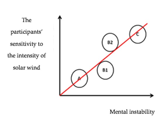 The initial tests were conceived to classify the respondents into groups (Figure 1) based on mental lability. Thus, most importantly, we obtained a set of participants who proved to be indifferent to changes in the intensity of solar activity and the effects of low-level, low-frequency electromagnetic fields; in terms of the classification, these people ranked as mentally stable (group A) [].