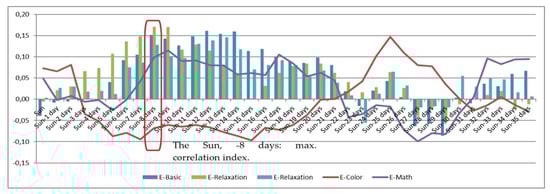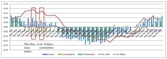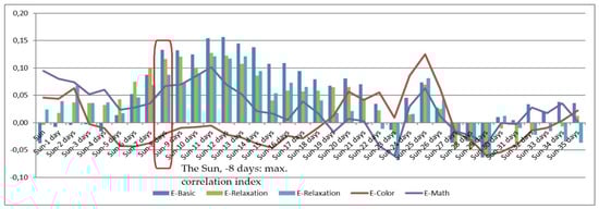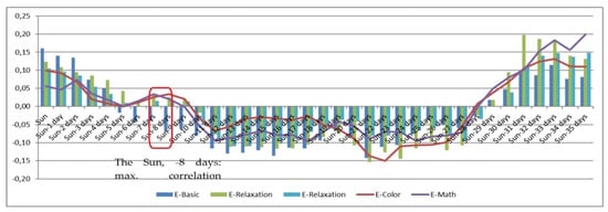 The presented experimental research monitored solar activity on a daily basis, establishing a set of correlations between the obtained solar-activity values and selected psychophysiological parameters. Solar activity changes reflect the actual variation in the Sun’s magnetic field (i.e., in the activity of solar wind particles), which affects the magnetosphere with a delay of between 2 and 8 days. For this reason, the horizontal axis in the correlation Figure 1, Figure 2, Figure 3, Figure 4, Figure 5 and Figure 6 (see below) represents the number of days since a series of significant solar eruptions; the vertical axis then expresses the relevant correlation index. The actual measurement involved stress stages (E-Color and E-Math), and these embodied the focus of the experiment as regards the variation of HRV parameters; we therefore used a different type of figure in this context. The other stages were relaxation-based, designed to separate the stress phases to ensure sufficient physical and/or mental recovery. In the relevant Figure 1, Figure 2, Figure 3 and Figure 4, the green and blue E-Relaxation columns characterize the conditions following the E-Color and E-Math stress phases, respectively. By extension, a related study [] proposes that a solar wind could be interpreted as collisionless plasma moving radially from the Sun at speeds oscillating between 300 and 800 km/s. The concentration of the wind varies between 1 and 10 particles per cm3, and its temperature ranges between 1 and 30 eV. The mass spectrum of the solar wind includes mainly protons (~0.96%) and helium nuclei (~0.04%), with a small percentage being represented by high-energy electrons.