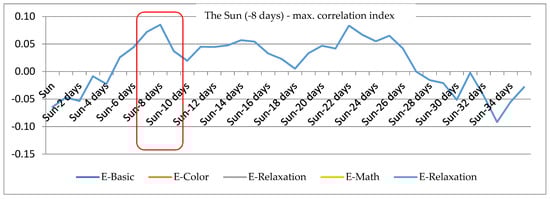 Figure 7 shows the correlation dependency of the psychophysiological parameter B (BVP VLF % power mean) on solar activity variation. A correlation maximum can be seen to occur at t = −8 (with a culmination between days −6 and −8), conveying a strong relationship between the two variables. The VLF band is another significant indicator of sympathetic activity. A relevant study [] revealed a VLF band increase in obstructive sleep apnea (OSA) patients, with the elevation being concurrent with hypoxemia (respiration arrest) episodes; thus, the VLF band was found to be associated with low levels of oxygen in blood. According to the research, the VLF band of heart rate variability in OSA patients is connected to internal oscillation in the vasomotor part of the baroreflex loop and can therefore be considered a direct result of sympathetic activity. The findings by Hadase et al. are in line with the results of our E-Color test, which show the strongest correlation between the observed variables: the physical load imposed by the reading out of colors increased lung ventilation. During the other experimental phases (E-Basic, E-Math, E-Relaxation), no significant correlation was observed between the VLF band of the HVR and solar activity variation.