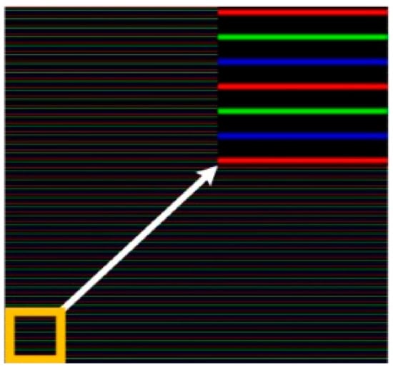 The coded RGB pattern is illustrated in Figure 2. The red lines, green lines, and blue lines are in the same intervals, parallel and repeated in cycles to form the RGB pattern. Between the adjacent lines, there are dark parts to separate them from each other. The intensities in different channels of the RGB color space contain both the color information and the lighting information, which makes the color segmentation problematic. On the other hand, color and brightness are separated in different channels as hue and value, which makes the color segmentation straightforward. Therefore, the RGB color space is transformed into the HSV color space for line segmentation. The transformation from the RGB color space to the HSV color space is formulated as follows.