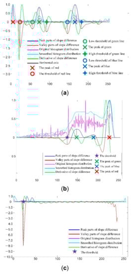 The line segmentation method is proposed based on these three characteristics: (1) the lines in red, green, and blue are distinguished in the H channel. Thus, there should be three clustering centers in the histogram of the H channel that correspond to the red pixels, the green pixels, and the blue pixels, respectively. The clustering centers are calculated by SDD as described in [,]. For each clustering center, there are two corresponding SDD valleys. One is on its left and the other is on its right. They are selected as the thresholds to segment the lines in the corresponding color. The process of selecting the double thresholds for the red lines, blue lines, and green lines in the H channel by SDD is illustrated in Figure 4a; (2) the RGB line parts and the dark parts are distinguished in the S channel. Thus, there should be one global threshold that can distinguish the RGB line part and the dark part. The global threshold is calculated with SDD as described in [,]. The process of the selecting the global threshold to separate the line part from the dark part in the S channel by SDD is illustrated in Figure 4b; (3) because the brightness of the RGB line part is highlighted in the V channel, the region of interest (ROI) of the RGB lines can be obtained from the V channel by a global threshold. The global threshold is calculated with SDD as described in [,]. The process of the selecting the global threshold to obtain the ROI of the RGB lines in the S channel with SDD is illustrated in Figure 4c.