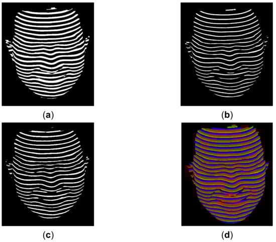 The major differences between the proposed method and the existing methods [,,,,] are summarized in Table 1. Compared to the proposed method, the major weaknesses of the existing methods include: (1) the existing methods were not able to segment the lines (stripes) as robustly as the proposed method was able to; (2) the existing methods were not able to index the lines (stripes) as robustly as the proposed method was able to. Consequently, their results in reconstructing deforming and moving objects are inferior to those of the proposed method, which can be verified by comparing the reconstruction results of the deforming hand in this paper and those shown in [].