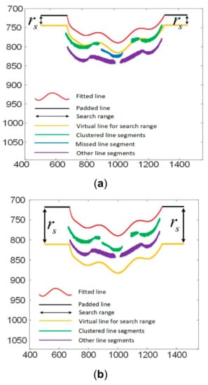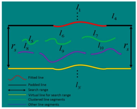 As illustrated in Figure 8, the combination of the line segments , and is clustered as the next line. Their combination is fitted by the line model (Equation (8)) and padded by Equation (12). Then, the newly fitted and padded line is used for the subsequent line clustering. As can be seen, the working principle of the proposed exclusion method is based on the selection of a large search range that includes line segments belonging to more than one line. If the search range is not large enough, it is easy to miss some line segments as illustrated in Figure 9.