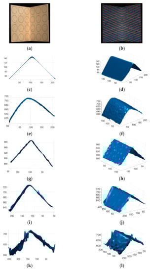 In our established structured light 3D imaging system, a BENQ MU706 projector with the resolution 1920 × 1200 was used to project the RGB line pattern. The projector was calibrated manually as follows: (1) the projection angle of the projector with reference to the object was selected as 90°; (2) the distance between the projector and the object was adjusted to make sure that the projected pattern could cover the object completely. In the conducted experiments, the distance was chosen as 70 cm; (3) the focus of the projector was adjusted manually to make sure that the RGB lines were clearly shown on the surface of the object; (4) the contrast and brightness of the projector were adjusted manually to make sure that the RGB lines acquired by the camera were clear enough for line segmentation. A Blackfly BFLY-PGE-50A2C-CS camera with the resolution 2592 × 1944 was used to acquire the pattern images. The camera was calibrated with the MATLAB camera calibrator toolbox to calculate the distortion parameters and they were calculated as , , , and , respectively. The structured light 3D imaging system was calibrated by a calibration grid with Equation (26) and Equation (30) to compute the parameters and , respectively. The computed by the calibration grid with 24 known marker points was [3.7747, 0.0174, −1.0601, 974.6918, −0.0827, 3.8175, −0.8671, 383.6297, −0.0000, −0.0000, −0.0010] and the computed by the calibration grid with 24 known marker points was [−0.1332, 3.5434, 0.4618, 335.1717, −0.0000, −0.0002, −0.0009]. After 3D calibration, the calibration grid was used to compute the reconstruction accuracy of the structured light 3D imaging system and the computed mean root squared error (MRSE) was 0.4581 mm.