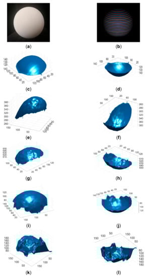 Reconstructed balls by different methods. (a) The image of the ball; (b) The acquired pattern image of the ball; (c) Reconstructed ball by the proposed method in view 1; (d) Reconstructed ball by the proposed method in view 2; (e) Reconstructed ball by Kinect V2 in view 1; (f) Reconstructed ball by Kinect V2 in view 2; (g) Reconstructed ball by Kinect V1 in view 1; (h) Reconstructed ball by Kinect V1 in view 2; (i) Reconstructed ball by Intel D435 ASV in view 1; (j) Reconstructed ball by Intel D435 ASV in view 2; (k) Reconstructed ball by Intel D435 SV in view 1; (l) Reconstructed ball by Intel D435 SV in view 2.