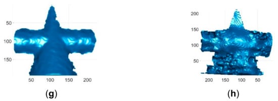 To verify the advantage of the proposed method over existing line indexing methods [,], the results of reconstructing similar objects are compared in Figure 18, Figure 19, Figure 20, Figure 21, Figure 22 and Figure 23. The red lines detected by local maxima [] are shown in Figure 18a and the red lines extracted by the proposed method are shown in Figure 18b. It is seen that the lines extracted by the proposed method are more accurate and more complete. In addition, the lines detected by local maxima could not be clustered robustly by the method proposed in this paper and the methods proposed previously in [,,]. By comparing the reconstructed face by the proposed method in Figure 18c,d and the reconstructed face from [] in Figure 18f, it is seen that the ear part reconstructed by the proposed method is significantly better. Similar to [], a moving and deforming hand was reconstructed by the proposed method and the reconstructed hands were compared with those with similar gestures from [] in Figure 19, Figure 20, Figure 21, Figure 22 and Figure 23. As can be seen, the reconstruction results of the proposed method are more accurate and more complete than the reconstruction results from [].