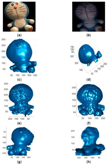 Reconstruction results of a colorful toy. (a) The toy image; (b) The acquired pattern image; (c) Reconstructed colorful toy by the proposed method in view 1; (d) Reconstructed colorful toy by the proposed method in view 2; (e) Reconstructed colorful toy by Kinect V2; (f) Reconstructed colorful toy by Kinect V1; (g) Reconstructed colorful toy by Intel D435 ASV; (h) Reconstructed colorful toy by Intel D435 SV.