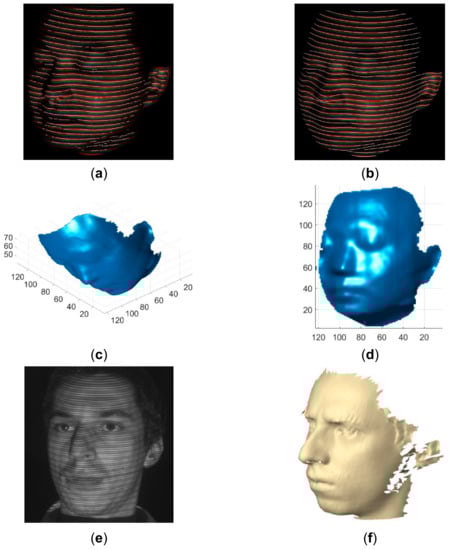 Qualitative comparison of the proposed method with the method proposed in []. (a) The detected red lines by local maxima superimposed on the acquired pattern image; (b) The extracted red lines by the proposed method superimposed on the acquired pattern image; (c) The reconstructed human face by the proposed method in view 1; (d) The reconstructed human face by the proposed method in view 2; (e) The acquired pattern image in []; (f) The reconstructed human face by the method in [].