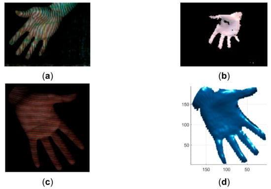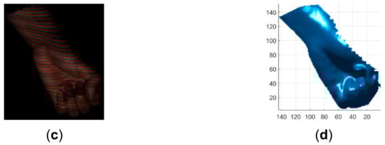 Qualitative comparison of the proposed method with the method proposed in []. (a) The acquired pattern image in []; (b) The reconstructed hand in []; (c) The acquired pattern image in this study; (d) The reconstructed hand by the proposed method.