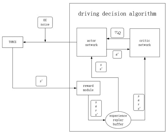 In order to solve this problem, the authors in [] propose the DDPG algorithm, which is an algorithm based on direct policy search that can directly output continuous action values, which is very suitable for continuous control environments. The author applied it to lane following and achieved good results in the TORCS environment. It combines actor-critic algorithm [], deterministic policy gradient [], and DQN algorithm []. However, using it directly in autonomous driving scenarios will have the following problems. First, in the DDPG algorithm, each iteration of the actor network will overestimate the Q value. When the number of training increases, the cumulative error will accumulate greatly. At the same time, the inaccurate estimation of the Q value will also lead to the decline of the strategy update effect. The second reason is that each step will produce a small error δ(s, a) during the TD update. When multiple updates are performed, the error will be accumulated in a large amount, resulting in an inaccurate Q value. Since the decision-making and planning layer of autonomous vehicles has higher requirements for the accuracy of the output action values, slight disturbances in the steering or throttle may cause the driving effect to decrease or even accidents []. The third is that experience replay is to randomly sample data stored in the experience pool, which will result in low expectations of the sampled samples and slower training []. For autonomous driving, a project that requires a lot of manpower and material resources will cause much waste of resources.