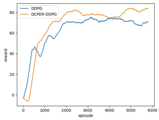 In deep reinforcement learning, the single-step average reward value of each episode is an important indicator to measure the training effect [,,,]. This paper counts the average single-step rewards of [] and DCPER-DDPG algorithm in 6000 episodes. Figure 6 is a comparison of the two after the data is Gaussian smoothed.