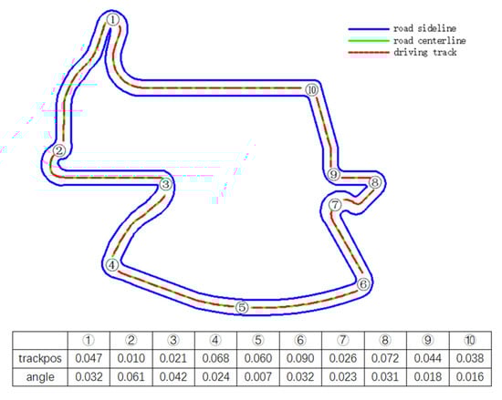 CG track 2 has more straight roads, so the speed and reward function of the improved algorithm have been greatly improved compared with []. In the comparison of the angle with the lane, the improved algorithm reduced by 81%, the effect was greatly improved, and the distance from the center of the road was also greatly reduced. It can be seen that the DCPER-DDPG algorithm has a stronger generalization ability than the original DDPG algorithm in lane following tasks.
