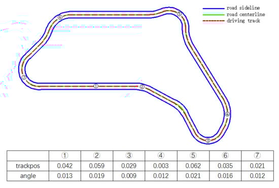 This paper chooses Aalborg as the training track, as shown in Figure 4. The map has a total length of 2587.54 m and a width of 10 m. The typical features of the track are obvious, such as lane lines and static obstacles. The length of the straight line of the Aalborg track is appropriate, and the curvature of the curve is large, which is suitable for verifying the deep reinforcement learning algorithm;
