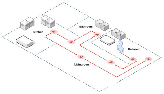 To assess the indoor positioning system’s performance, a realistic scenario was created in which the user wore a smartwatch or placed a smartphone in his or her pocket and moved around his or her home. The house measured 15 m × 7 m and had five rooms. A path was defined inside the house that led to four different rooms, each with one or more BLE beacon. The user started to follow the established path from the bedroom, as shown in Figure 3. One or more checkpoints were established for each room (indicated by the circle icon).