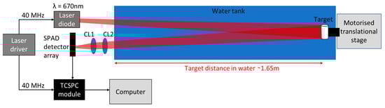 Figure 1 shows the schematic of the experimental setup. The illumination source used was a pulsed semiconductor laser diode (PicoQuant LDH-P-C-670M, PicoQuant GmbH, Berlin, Germany) with central wavelength λ = 670 nm, a repetition rate equal to 40 MHz, and a pulse-width of approximately 120 ps that dominated in the overall temporal response of the system. The operational wavelength was selected to correspond with the spectral maximum transmittance in highly scattering environments (>5 AL), as demonstrated previously [17]. The laser was highly diverging in one axis, which was orientated along the horizontal axis at the target position. The target was placed in a 1750 mm long, 250 mm wide, 250 mm high water tank. The distance of the target in water was approximately 1.65 m. During a depth profile measurement, the target was moved along the vertical direction using a motorized translational stage. The speed of the target was 10 mm/s and the distance travelled by the target was 100 mm, which meant that all the scans shown in this initial demonstration were performed by using an overall acquisition time equal to 10 s.