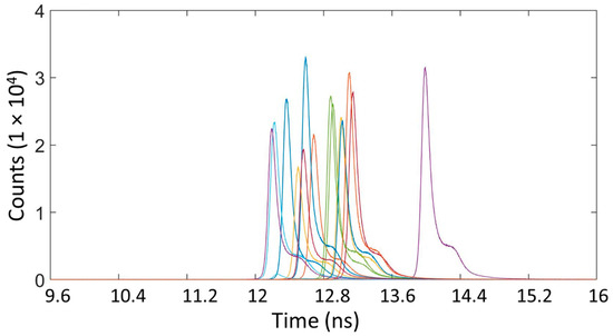 Figure 2 shows the instrumental timing response of the system for each of the detectors. This instrumental response is the timing response for the entire imaging system, and is the convolution of the temporal responses of the laser system, the detectors and the timing electronics. The instrumental response measurement was performed in unfiltered tap water, using a Lambertian reference flat target with nominal reflectance equal to 99% (Spectralon Diffuse Reflectance Target, Labsphere, North Sutton, NH, USA). The average optical power used was 27 nW, and the acquisition time was approximately 40 s. The repetition rate of the synchronization signal was 40 MHz, corresponding to a period of 25 ns in the histogram. The instrumental response was measured over the full period; however, Figure 2 displays a reduced timing interval of approximately 6.5 ns in order to illustrate the instrumental responses with greater clarity. The relative delays in the peak returns from the flat reference target in the instrumental response are fixed delays between the detectors, which are due to small differences in the output voltages of the integrated pick-up circuit of each detector. Hence, it is vital to perform the cross-correlation using the raw data and instrumental timing response from each individual detector, rather than an average timing response over the whole array. In addition, the histogram in Figure 2 shows a shoulder on the right side of each peak, which originated from the pulsed laser diode source used in the experiments. Therefore, to maintain an identical temporal profile of the laser pulse in all the measurements, the driving current of the laser was chosen in order to maximize the overall energy in the pulse while maintaining an individual peak in the temporal profile. The use of higher driving currents would increasingly cause a second peak to become more dominant, which would eventually affect the timing, and depth, resolution possible. This meant a maximum average optical power of approximately 15 mW was used for the scans in highly scattering environments (>6 AL). At lower scattering levels, the average optical power was reduced with the use of ND filters in order to avoid saturation of the detector.