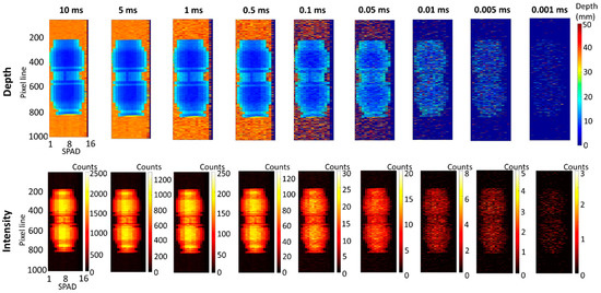 The depth and intensity profiles are shown in Figure 4 in the top line and bottom line, respectively. The results are shown for decreasing acquisition times from 10 ms to 1 μs. The depth and intensity profiles at the longest acquisition time of 10 ms show the sub-millimeter depth resolution achievable by the system. As the acquisition time per line is decreased, the resolution of the image decreases accordingly. However, the target can be reconstructed at the acquisition time per line of 5 μs, and still be detected at the acquisition time per line of 1 μs.