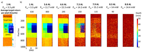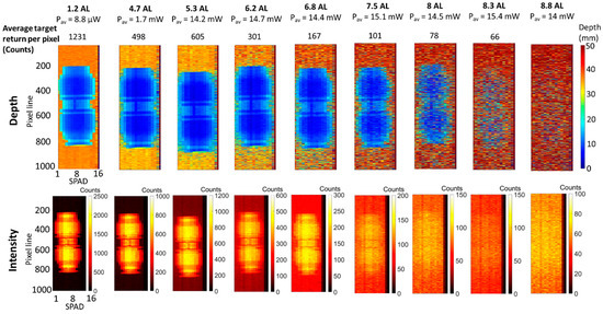 The main results are shown in Figure 5. The first column shows the case of unfiltered tap water, which was equivalent to an attenuation of 1.2 AL between the transceiver and the target. The next columns show the increasing level of scattering in water up to 8.8 AL. As the level of scattering is increased, the depth resolution of the depth profile decreases because of the lower photon return from the target and the higher level of background. With additional attenuation, the backscatter increases the background count level as well as reducing the signal strength, leading to a deterioration in the quality of the reconstructed image. However, the results show that the target can be reconstructed with the cross-correlation approach up to 8 AL. At higher levels of scattering, the target can be detected up to 8.3 AL but then the target cannot be distinguished from the background, preventing the depth estimation. The average optical power of each scan was adjusted using ND filters depending on the level of scattering, to optimize the return from the target without saturating the SPAD detector array. The average target return in each environment indicates the average return from the target calculated by adding the events in a timing interval of 150 bins width centered on the timing bin with the maximum value of the cross-correlation. In addition, the contribution of the background was subtracted by the return peak, and it was calculated over 150 bins next to the return peak from the target. Then, the average was performed over the 8 SPAD detectors in the central part of the target only.