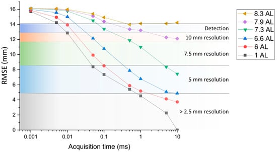 where x is the depth estimated in the profiles, and d is the depth estimated in the reference scan, which was the case of unfiltered tap water and acquisition time per line equal to 10 ms. The comparison was performed only over the pixels corresponding to the target area, which means that the backplane was not considered in the calculations and the number of pixels n in Equation (3) was varied in the target area from line 200 to line 600, i.e., N = 6400. In addition, shorter acquisition times were investigated for each environment and compared with the chosen ground truth. The RMSEs calculated for each set of data are shown in Figure 7, along with the achievable depth resolution obtained by inspecting the depth profiles retrieved with the cross-correlation approach. The graph shows that the depth resolution of the image in unfiltered tap water starts to deteriorate at the acquisition time per line of 0.5 ms, and centimeter resolution is achievable at 0.01 ms. At shorter acquisition times, the target can be resolved using acquisition times per line up to 0.005 ms, and cannot be detected beyond this limit. In the case of the pipe connector target, detection was possible at shorter acquisition times due to the higher reflectivity of the target.