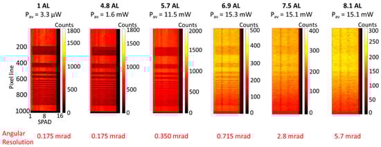 The spatial resolution of the system was investigated performing the scan of the variable lines resolution target (Figure 3c) in several scattering environments. The data were analyzed with the cross-correlation approach, choosing 1000 lines and an acquisition time per line of 10 ms, which are the same parameters used in the previous sections. The intensity maps of the target are shown in Figure 8, and the average optical power of the scans were adjusted according to the level of scattering of the water, varying in the range from 3.3 μW to 15 mW. The lines of thickness equal to 0.312 mm can be resolved in attenuation levels up to 4.8 AL, which is equivalent to an angular resolution of 175 μrad. However, due to the forward scattering events detected, the achievable angular resolution increases to 5.7 mrad at 8.1 AL, and at higher attenuation levels it is not possible to resolve the target in the intensity map.