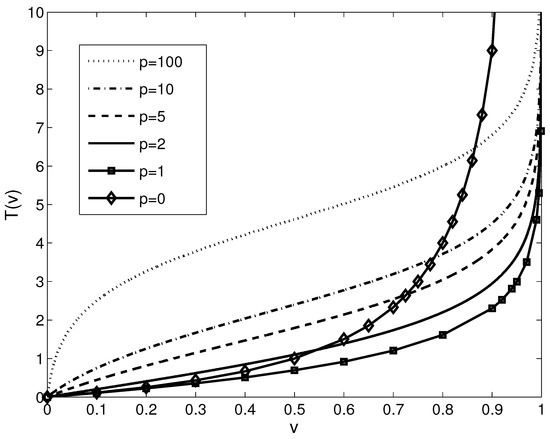The generator function is a bijective function and since it is strictly monotonic, it thus becomes more than an isomorphism; it becomes a homeomorphism. Still, in order to keep the same expression as in the various references used for comparison, the function in (34) will be denoted as an isomorphism. Indeed, the isomorphism in (34) is parametrized by the parameter p; specific choices for p are presented in Table 1 and graphically shown in Figure 1.