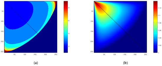 Testing of the optimal solution for (37) was performed extensively, over the entire range of possible image graylevels. Figure 2a,b show the most important results: , the order of the FLIP model that is the best (Figure 2a) and the ratio (Figure 2b). The ratio of the best FLIP dynamic range to the best classical LIP dynamic range is mostly bigger than 1, showing that in 67% of the image cases, one can achieve a bigger dynamic range using a FLIP with . The dynamic range increase ranges from to , with an average of .