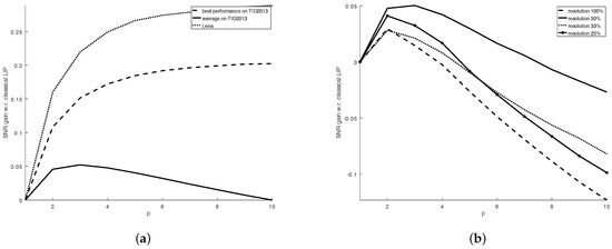 In the significant majority of cases (as Figure 4a shows for the selection of images from the classical TID2013 image quality database [30]), the filtering performance (in terms of SNR) was increased by using FLIP models with a high p value. Figure 4a depicts the difference between the SNR obtained for the image filtered with FLIP-based averaging with and the SNR obtained for the image filtered with FLIP-based averaging with (that is, ). The improvements are marginal, but non-negligible. Another quality estimation of the filtering result can be performed by using a non-reference image quality measure. One such measure is BRISQUE (Blind/Referenceless Image Spatial QUality Evaluator) [31], which computes a number within claimed to integrate the naturalness losses of images due to various distortion types. As such, the smaller the BRISQUE measure, the more naturally looking (and distortion-free) the image looks. The BRISQUE measure computed for the averaged TID2013 database images shows that an increased value of the parameter p can bring a very slight improvement in the naturalness of the image, as the BRISQUE values for the images average filtered by FLIP with (BRISQUE = 32.45 on average for the entire database for ) are consistently smaller than the BRISQUE values for the images average filtered by the classical LIP (BRISQUE = 32.71 on average for the entire database).