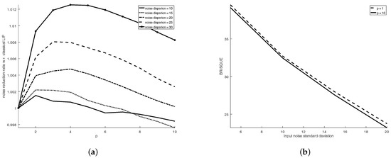 (a) Plot of the noise reduction ratio of the FLIP models with with respect to the classical LIP model (FLIP with ) for various WAGN dispersions. (b) Average BRISQUE value (smaller is better) of the average filtered images from the TID2013 database for various WAGN dispersions, for images processed by the classical LIP model () and FLIP with .