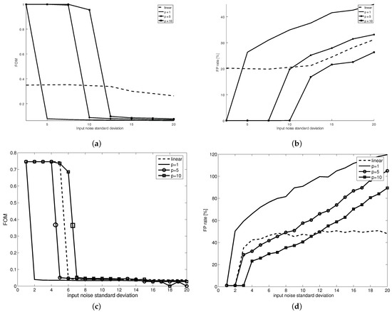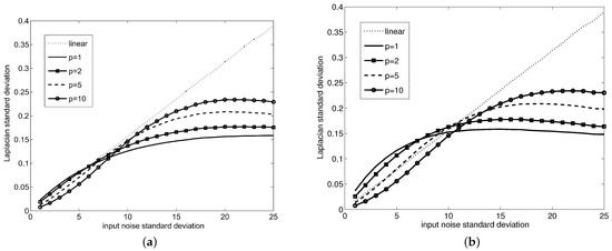 As Figure 7 shows, the FOM increases (and the Laplacian performs better) with the increase in the FLIP model order (p), for all noise dispersions. Still, the classical, linear Laplacian performance is matched and sometimes exceeded in the case of high-order FLIP models. Figure 7b shows the false positive edge pixel ratio for the same test images; it can be seen that while there is a general, natural increase in the false positive edge pixels ratio induced by the increase in the noise standard deviation, the FLIP models with can perform better than the classical, linear Laplacian.