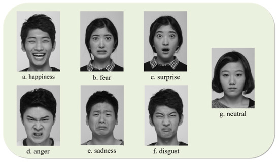 A series of photos containing six basic emotions and a neutral facial expression were presented to participants, which consisted of seven stimuli and had been selected by researchers from a photography dataset used in a previous study [50]. Instructions were given in both verbal and visual form, and the participants were asked to answer verbally for stimuli. Then, participants performed posed facial expressions for the given list of six basic emotions and the neutral emotion. For example, for happy facial expression, a photograph of a person with a happy face was presented; participants were asked to identify the emotion conveyed; and “make a happy face for 15 s towards the camera” to be video recorded. The facial stimuli were given once participants were fully aware of the instruction of the study. Examples of stimuli are shown in Figure 1. Each facial stimulus was presented for a maximum of 7 s; the researcher moved on to the next stimulus when the participant made a verbal response. Facial expressions were acquired for a total of 105 s for each emotion.