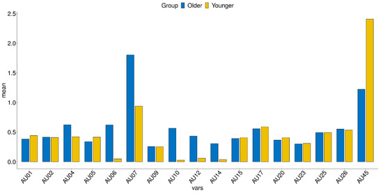 Previous studies well support the differences in AUs intensity between the two groups. On upper facial expression, namely AU 06 and 07, the older adults can show greater intensity than the younger adults. Increased activity in orbicularis oculi muscle [81], deeply set of eye [82], and changes in eyelid due to poor visual acuity [83] may have affected the changes in upper facial expression. For lower facial expression, AU 10, 12, 14, the strength of the face may have been further tapped due to the highlighted facial contour caused by loss of subcutaneous fill around the nose and mouth in the older adults [84]. In AU 45, the older adults rather showed reduced AUs than the younger people. Elevated duration of eye blink may explain this reason. Duration of the eye-blinking decreases with aging, apparently reflecting decreased intensities in AU 45 [85], since the deterioration of the orbicularis oculi muscle can affect the complete eye closure rate [86].