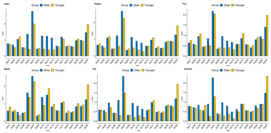 Figure 2 and Figure 3 demonstrate the AU values of the older and younger adults for the neutral and emotional face. The results applied for multiple comparisons are presented in Table 3. In AU 06, 07, 12, and 14, older adults showed higher intensity compared to younger adults. For AU 45, older adults showed lower intensity than younger adults.