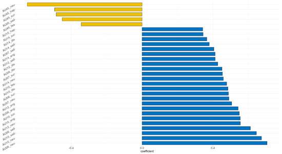 Descriptive statistics for demographic variables were calculated as mean scores and standard deviations. The difference in AU was compared, applying for multiple comparisons (followed by Bonferroni correction). Chi-squared tests were used to compare categorical outcomes such as sex and usage of botulinum toxin (botox). The correlation between age and the AU intensity was investigated. To explain multivariate profiles with respect to input features that were accurately distinguished from the older group, the adaptive least absolute shrinkage and selection operator (LASSO) ML algorithm were applied to the dataset [66]. The adaptive LASSO, which is a regularized regression method with L1-norm penalty [67] is a popular technique for simultaneous estimation and consistent variable selection [66]. It is a powerful model that performs regularization and feature selection, and it can provide model interpretability by excluding irrelevant features that are not related to the class from the model. L1 regularization, which penalizes elements of redundant complexity, focuses on the most significant features, and thus prevents overfitting of the data and is supported by well-grounded theoretical analysis [68]. The regression coefficients of unimportant variables shrank to 0 upon implementing the adaptive LASSO. In that regard, the adaptive LASSO algorithm provided interpretable results related to the older adults. Due to its high accessibility and low computational complexity as compared with other feature selection models, recently, this approach has been highly recommended in behavioral science [69].