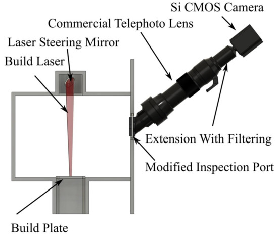 The viewport of a commercial Renishaw SLM 125 metal L-PBF machine was modified to allow unrestricted off-axis optical access, as per Figure 2. A commercial 300 mm focal length telephoto lens was used to focus an image of the build plane onto a silicon (Si) Focal Plane Array (FPA) sensor. A 16 bit, thermoelectrically cooled, Si CMOS FPA camera was used. Figure 3 shows a photograph of the setup in situ. The camera was used to acquire a series of digitally measured images of the radiance (reported in digital levels (dls) of the camera’s image output) of the surface throughout the build process. The pertinent build parameters and the imaging system properties are shown in Table 1. The maturity level of Si technology offers higher-specification instruments at a given price point than other, longer-wavelength, FPA technologies.